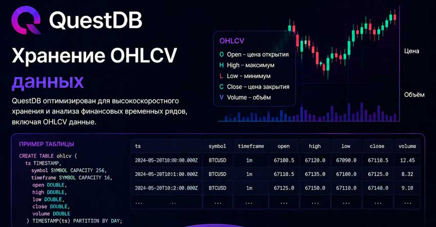 - Тип SYMBOL в QuestDB специально создан для повторяющихся строк — внутри хранит числа, фильтрация быстрая