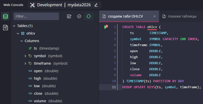 Добавим первую таблицу для хранения OHLCV, для этого в веб-консоли QuestDB в редактор кода вставьте код: