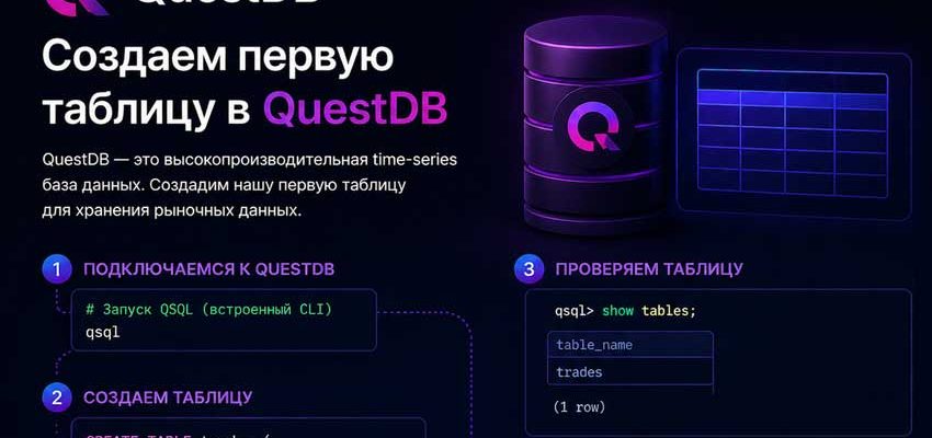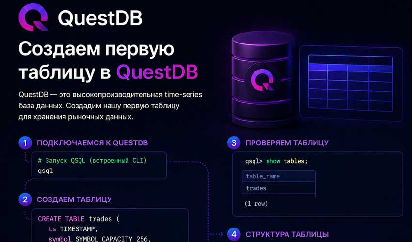 Команда CREATE TABLE создаёт новую таблицу. Всё что внутри скобок — это колонки и их типы данных. Всё что после скобок — специальные инструкции для QuestDB как хранить и организовывать данные.